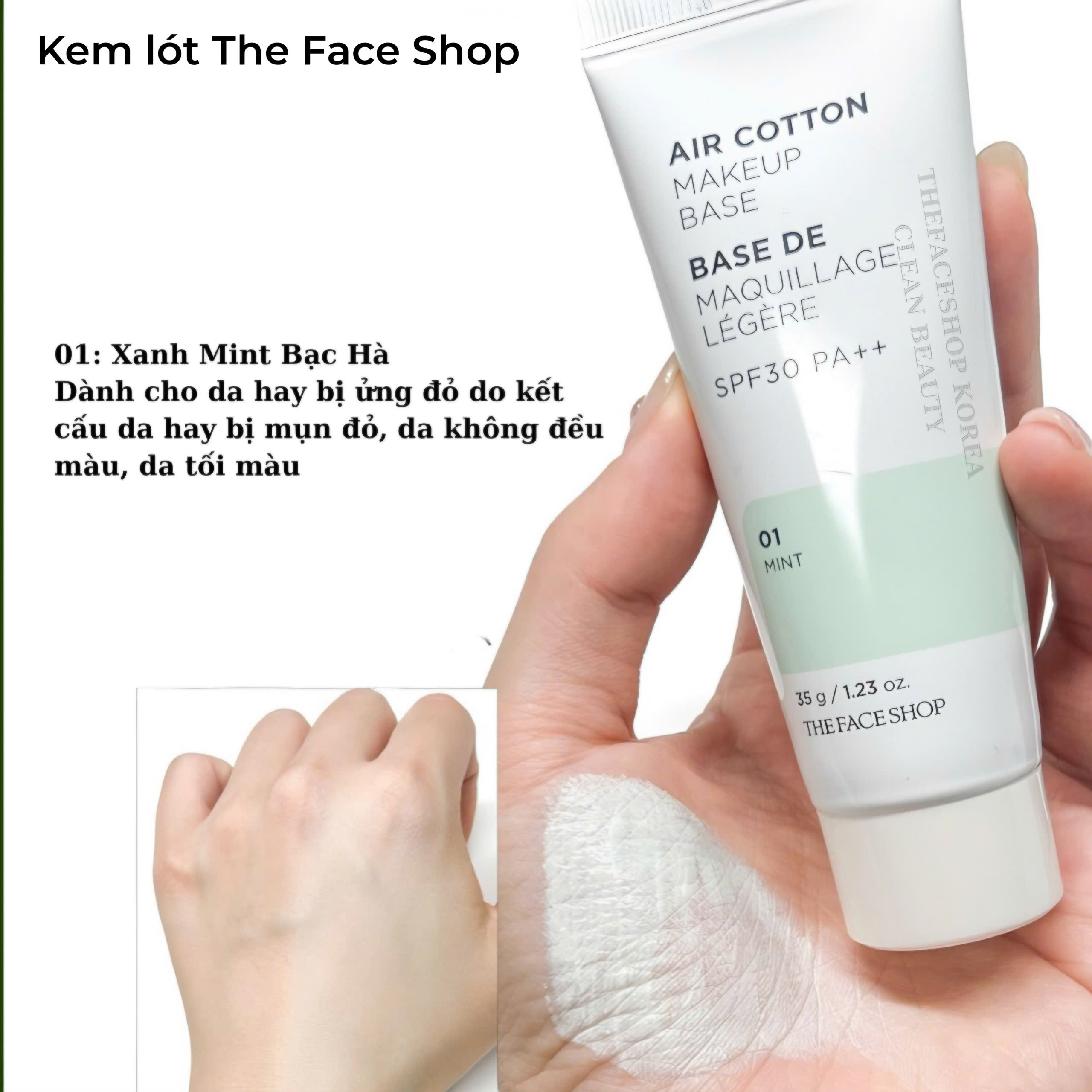 Đánh giá Kem lót kiềm dầu, nâng tone, chỉnh sắc da The Face Shop Air Cotton Makeup Base 35g – Hàn Quốc #Màu Xanh Lá