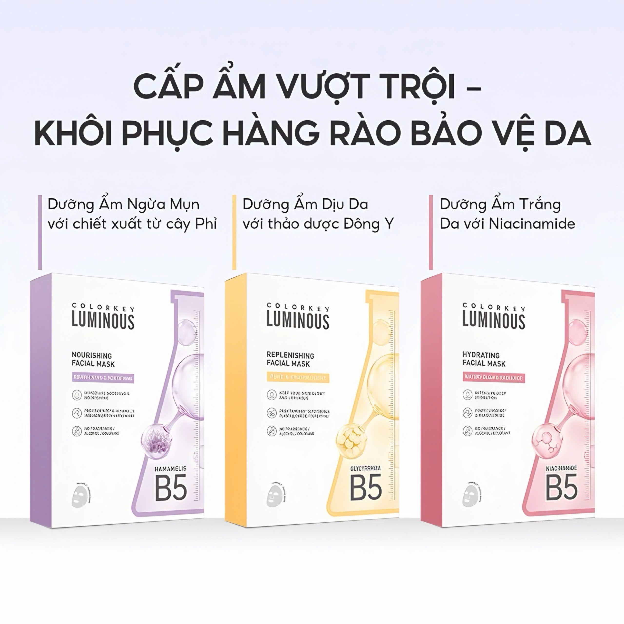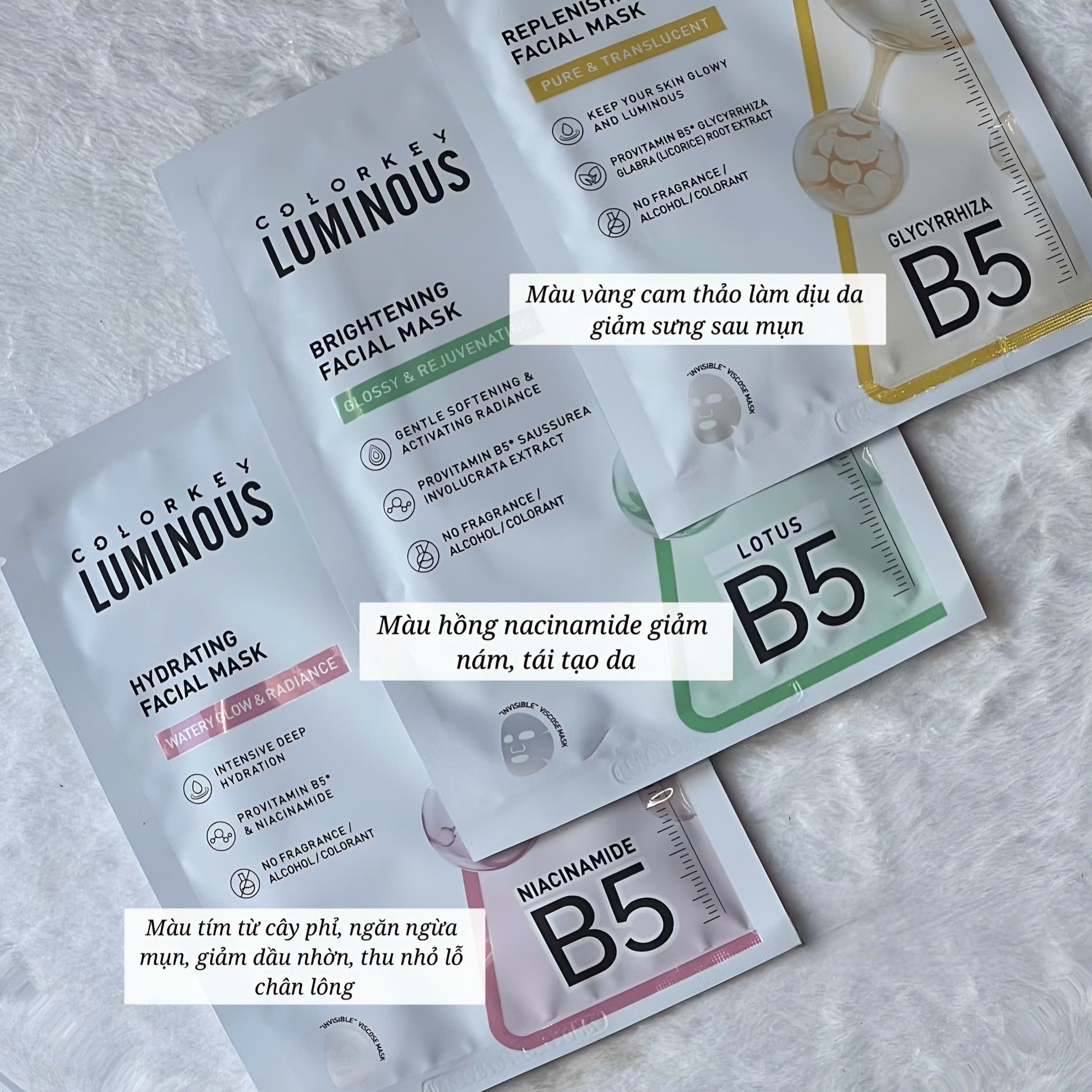 ✔️ Colorkey Luminous B5 Facial chứa tinh chất đậm đặc kết hợp B5 phục hồi da mạnh mẽ. Giúp cấp ẩm sâu, làm dịu tức thì và mang lại làn da mềm mịn, tươi sáng chỉ sau một lần đắp.